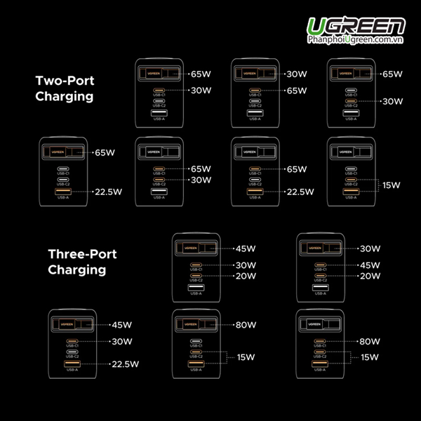 Tính năng Sạc điện thoại 2 cổng USB-C và 1 cổng USB-A GaN 100W kèm dây rút USB-C Ugreen 65827 X616