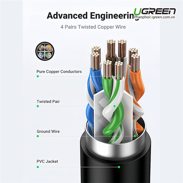 - Cáp mạng Cat6 Ugreen có cấu tạo lõi chất lượng cao với 8 dây bện đồng , tốt hơn so với hiệu suất hơn so với hợp kim nhôm đồng như dây mạng khác.