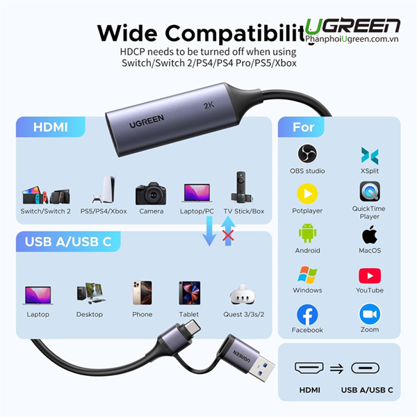 Card thu capture HDMI Ugreen 15389 tương thích với các hệ điều hành Windows, Mac OS, Linux, iOS17 và Android và nhiều phần mềm thu khác nhau: OBS studio, XSplit, Potplayer, QuickTime Player... Thiết bị tương thích: Nintendo Switch/PS4/PS5/Xbox Series X; iPad/Máy tính xách tay/PC/điện thoại di động.