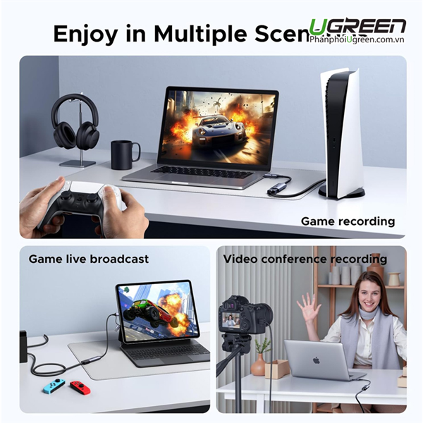 - Sử dụng máy tính xách tay/máy tính bảng làm màn hình Biến máy tính xách tay hoặc máy tính bảng của bạn thành màn hình với card thu tín hiệu HDMI sang USB của UGREEN! Nếu bạn muốn [xem chương trình truyền hình] trên máy tính xách tay/máy tính bảng của mình, chỉ cần kết nối TV stick với card thu tín hiệu HD của chúng tôi. Hơn nữa, nếu bạn muốn [chơi trò chơi điện tử] trên máy tính xách tay/máy tính bảng, bạn chỉ cần kết nối card thu tín hiệu HDMI của chúng tôi với máy chơi game của bạn.